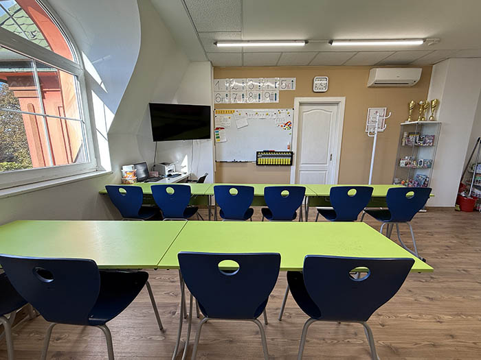 A tanterem oktatásra teljesen felszerelt, tábla és tv biztosított.